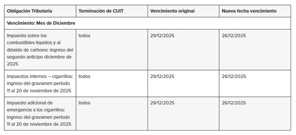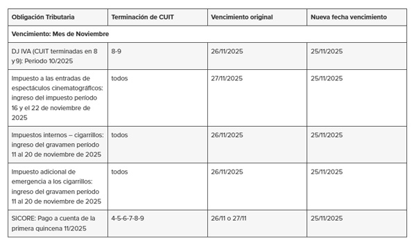 Adelanta, las fechas de vencimiento para la presentación de declaraciones juradas y el ingreso de obligaciones fiscales originalmente previstas para fines de noviembre y diciembre de 2025, quedando de la siguiente manera: