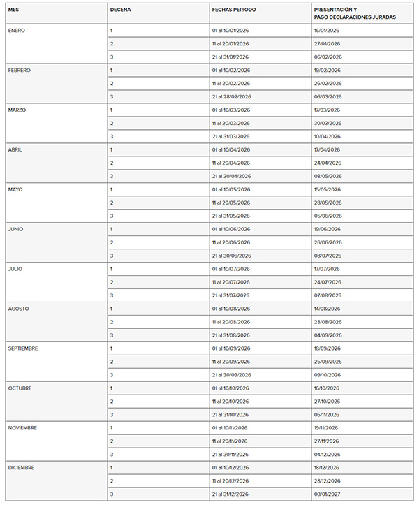 Dispone las siguientes fechas de vencimiento para la presentación y pago de las declaraciones juradas decenales del período fiscal 2026, referidas al Sistema Informático de Recaudación y Control de Acreditaciones en Cuentas de Pago “SIRCUPA”, aplicable sobre los importes que sean acreditados en cuentas de pago de las empresas Proveedoras de Servicio de Pago (PSPOCP):